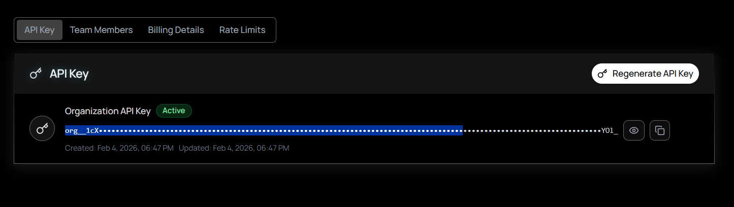 - Navigate to API Keys: While signed in, select API Key on the left sidebar. Your organization's API key is displayed and ready to copy.